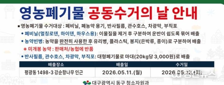 정안뉴스 안정주 기자 | 대구 동구청은 5월 27일까지 농촌지역에 영농폐기물 공동수거의 날을 지정해 운영한다.