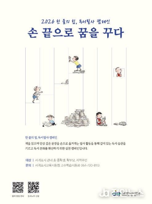 정안뉴스 안정주 기자 | 서귀포시교육지원청은 학생과 보호자 그리고 교원 등 교육공동체가 함께 참여하는 ‘2026 한 줄의 힘, 독서필사 캠페인’을 운영하며 일상 속 독서문화 확산에 힘쓰고 있다.