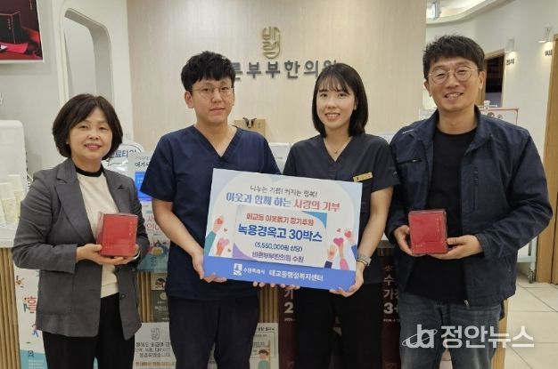 정안뉴스 안정주 기자 | 수원시 팔달구 매교동는 지난 27일, 바른부부한의원 수원으로부터 5,550천원 상당 녹용경옥고(30개입) 30박스를 기부받았다고 밝혔다.