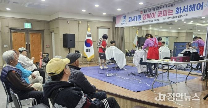 정안뉴스 안정주 기자 | 수원시 팔달구 화서1동은 지난 28일, 대한미용사회 팔달구지회와 협력하여 관내 취약계층 어르신을 위한 ‘찾아오는 이미용 서비스’를 운영했다.