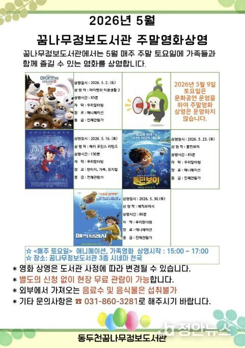 정안뉴스 안정주 기자 | 동두천시 도서문화사업소 정보도서관에서는 오는 5월 매주 토요일 어린이와 가족을 위한 애니매이션 및 가족영화 4편을 상영한다고 밝혔다.
