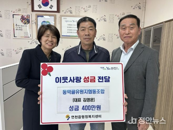 정안뉴스 안정주 기자 | 동막골유원지협동조합은 지난 28일 오후 4시 연천읍행정복지센터 읍장실에서 이웃돕기 후원 성금 400만 원을 기탁했다.