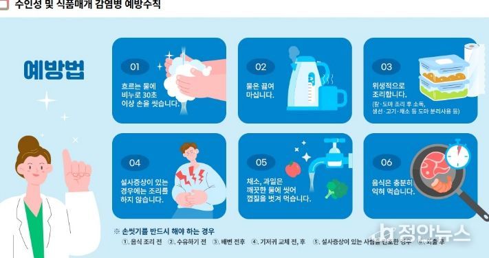 예방을 위해서는 ▲올바른 손씻기 생활화 ▲음식 충분히 익혀 먹기 ▲물 끓여 마시기 ▲설사 증상 시 음식 조리 금지 ▲위생적인 조리 환경 유지 등 개인위생 수칙을 철저히 지켜야 한다.