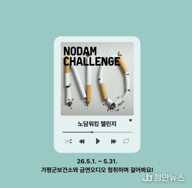 정안뉴스 안정주 기자 | 가평군보건소가 ‘세계 금연의 날’을 앞두고 5월 1일부터 한 달간 금연 인식 확산을 위한 ‘노담워킹 챌린지’를 진행한다. 이번 행사는 일상 속 걷기 실천과 금연 홍보를 병행해 군민들의 건강한 생활 습관 형성을 돕고자 마련됐다.