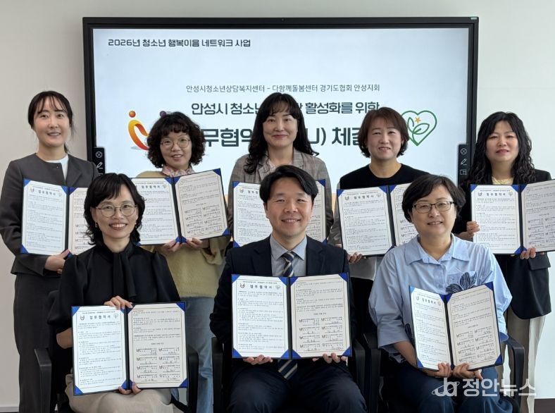 정안뉴스 안정주 기자 | 안성시청소년상담복지센터는 지난 27일 안성맞춤공감센터에서 다함께돌봄센터 경기도협의회 안성지회와 청소년의 건강한 성장과 복지 증진을 위한 업무협약(MOU)을 체결했다.