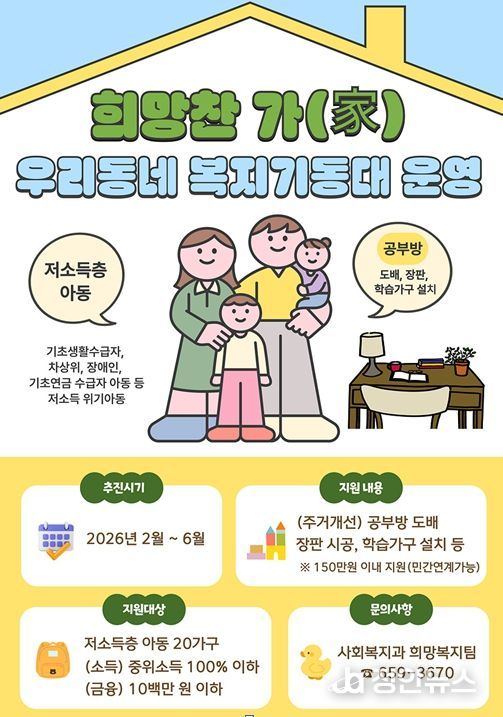정안뉴스 안정주 기자 | 여수시는 저소득층 아동의 학습 여건 개선과 안전한 주거공간 조성을 위해 2026년 주거환경 개선사업 ‘희망찬 가(家)’를 추진한다고 밝혔다.