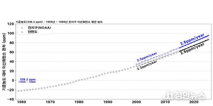 보고서에 따르면 우리나라의 2025년 이산화탄소 배경농도(432.7 ppm, 2024년 429.5 ppm)는 전지구 평균(425.6 ppm, 2024년 422.8 ppm)보다 7.1 ppm 높은 수준을 기록했다. 전년 대비 3.2 ppm 상승해 최근 10년(2015~2024) 기간 중 두 번째로 큰 연간 증가폭을 보였다. 또한, 우리나라에서 가장 오랜 기간(1999년~) 관측해 온 안면도 이산화탄소 관측 결과를 근거로 우리나라 이산화탄소 배경농도는 2000년 이후 연 2.5 ppm씩 높아지고 있고, 최근 10년에는 연 2.6 ppm의 속도로 증가하고 있다고 밝혔다. 아울러, 전지구 평균 증가 속도는 2000년 이후 연 2.3 ppm, 최근 10년 연 2.6 ppm이다.