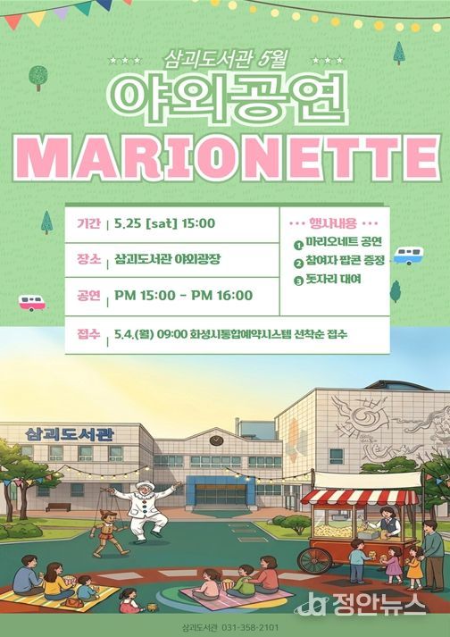 정안뉴스 안정주 기자 | 화성시립 삼괴도서관은 5월 가정의 달을 맞아 오는 5월 23일, 도서관 야외광장에서 가족 단위 이용자를 위한 특별한 문화행사를 운영한다. 따뜻한 봄날의 야외 공간에서 누구나 편안하게 즐길 수 있도록 마련된 이번 행사는 도서관을 찾는 시민들에게 색다른 문화 경험과 여유로운 시간을 제공할 예정이다.