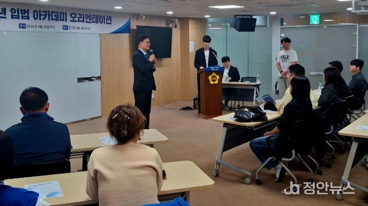 정안뉴스 안정주 기자 | 경기도의회 더불어민주당 최종현 대표의원(수원7)은 4월 28일 경기도의회 중회의실에서 열린 ‘2026년 청년입법아카데미 오리엔테이션’에 참석해 청년들의 정치 참여와 지방의회 입법과정에 대한 중요성을 강조했다.