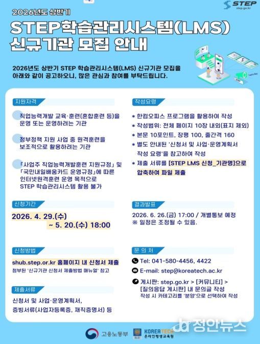 정안뉴스 안정주 기자 | 한국기술교육대학교 온라인평생교육원(원장 한연희)은 고용노동부와 함께 2026년도 상반기 스텝(STEP) 학습관리시스템(LMS, Learning Management System)을 활용할 참여기관을 모집한다.