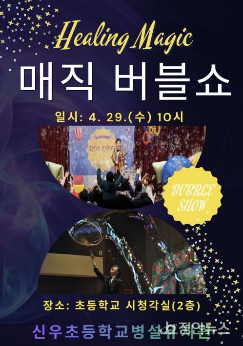 정안뉴스 안정주 기자 | 신우초등학교병설유치원은 4월 29일 교내 시청각실에서 ‘힐링 매직버블쇼’ 공연을 개최했다고 밝혔다. 이번 공연은 유아들이 직접 참여하며 즐길 수 있는 체험형 프로그램으로 마련됐다.