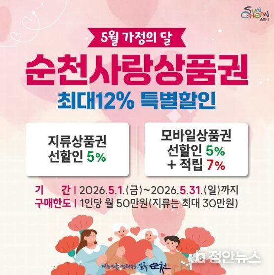 정안뉴스 안정주 기자 | 순천시가 5월 한 달간 순천사랑상품권 특별 할인행사를 추진해 시민들의 가계 부담을 덜고 지역 소상공인에게 활력을 불어넣는 소비 촉진에 나선다.