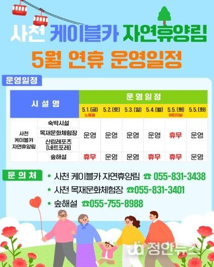 정안뉴스 김재홍 기자 | 사천시는 5월 가정의 달과 어린이날을 포함한 연휴 기간을 맞아 사천케이블카 자연휴양림의 이용객 편의를 위한 시설별 5월 연휴 운영 계획을 안내했다.