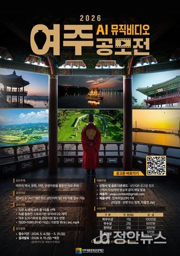 정안뉴스 안정주 기자 | 여주세종문화관광재단은 여주시 관광 콘텐츠를 활용한 시민 참여형 영상 제작 프로젝트인 '2026 여주 AI 뮤직비디오 공모전'을 개최한다고 밝혔다.