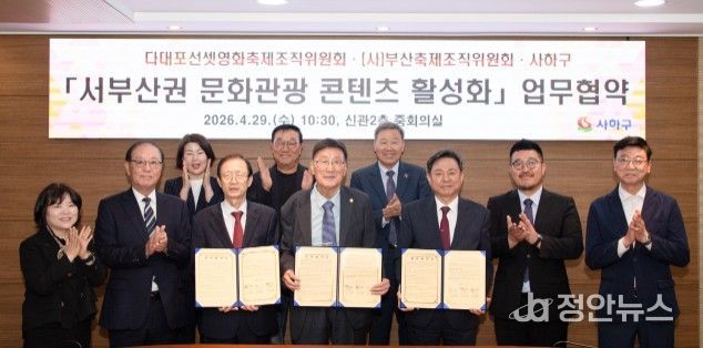 정안뉴스 안정주 기자 | 부산 사하구는 서부산권에서 개최되는 축제 및 문화 행사를 중심으로 지역 문화관광 콘텐츠의 발전 가능성을 함께 모색하고 지속가능한 협력 기반을 마련하기 위해 4월 29일 다대포선셋영화축제조직위원회, 부산축제조직위원회와 업무협약을 체결했다고 밝혔다.