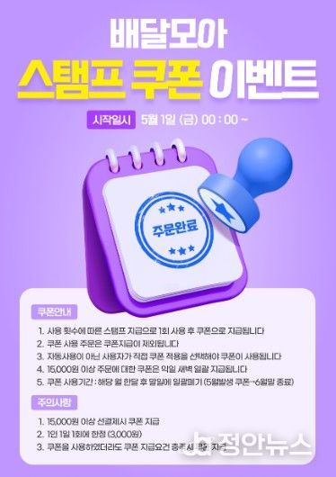 정안뉴스 안정주 기자 | 제천시는 공공배달앱 ‘배달모아’ 이용 고객을 대상으로 5월 1일부터 ‘스탬프 쿠폰 이벤트’를 진행한다.