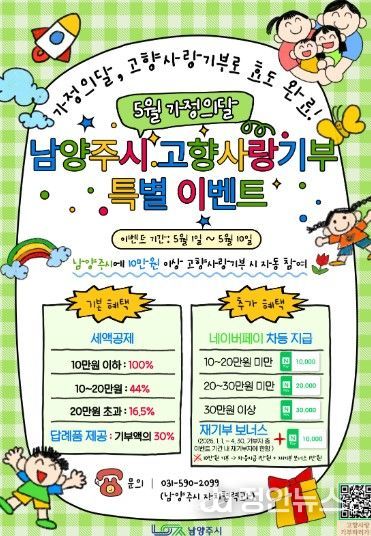 정안뉴스 안정주 기자 | 남양주시는 가정의 달을 맞아 5월 1일부터 10일까지 고향사랑기부 특별선물 증정 이벤트를 추진한다고 30일 밝혔다.