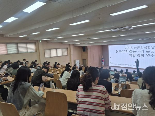 정안뉴스 안정주 기자 | 충남교육청은 29일, 충청남도교육청교육연수원(공주)에서 2026학년도 ‘바른 인성 함양 연극・뮤지컬 지도교사 배움자리’를 개최했다. 이날 행사는 도내 초중고 연극·뮤지컬 동아리 지도교사 80여 명을 비롯해 14개 교육지원청 담당 장학사, 충남교육연극협회 운영진 등 총 120여 명이 참석했다.