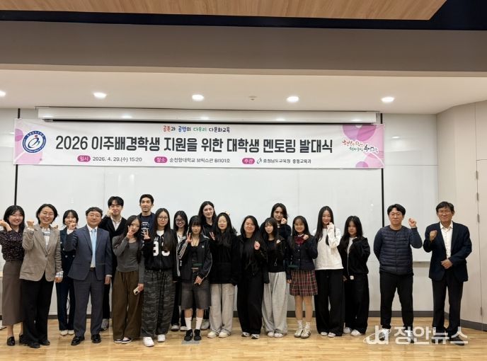 정안뉴스 안정주 기자 | 충남교육청은 29일, 순천향대학교(아산)에서 순천향대 지도자 학생 6명과 온양용화고·아산충무고 학생 20명, 담당 교사 등 30여 명이 참석한 가운데 ‘2026 이주배경학생 지원을 위한 대학생 지도 발대식’을 개최했다.