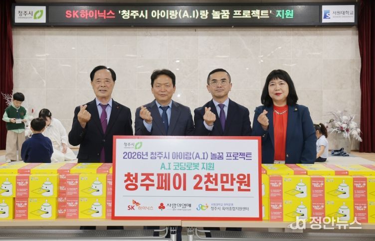 정안뉴스 안정주 기자 | 청주시는 29일 SK하이닉스㈜가 지역 영유아 대상 인공지능(AI) 코딩교육 지원을 위해 2천만원 상당의 청주페이를 청주시육아종합지원센터에 기탁했다고 밝혔다.