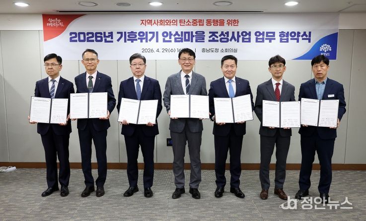 홍종완 도 행정부지사는 29일 도청 소회의실에서 송무경 공주시 부시장, 신필승 서산시 부시장, 황침현 당진시 부시장, 이주영 태안군 부군수, 엄경일 한국서부발전 기술안전부사장, 김정배 에스피삼화 사업총괄(CBO)과 ‘지역사회와의 탄소중립 동행을 위한 기후위기 안심마을 조성 사업’ 업무협약을 체결했다.
