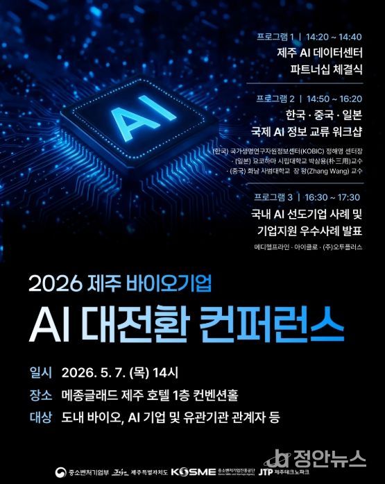 정안뉴스 안정주 기자 | 제주테크노파크(원장 지영흔, 제주TP)는 오는 5월 7일 오후 2시 메종글래드 제주 호텔에서 도내외 바이오 및 AI 산업 관계자 100여 명을 대상으로 ‘제주 바이오기업 AI 대전환(DX) 컨퍼런스’를 개최한다고 30일 밝혔다.