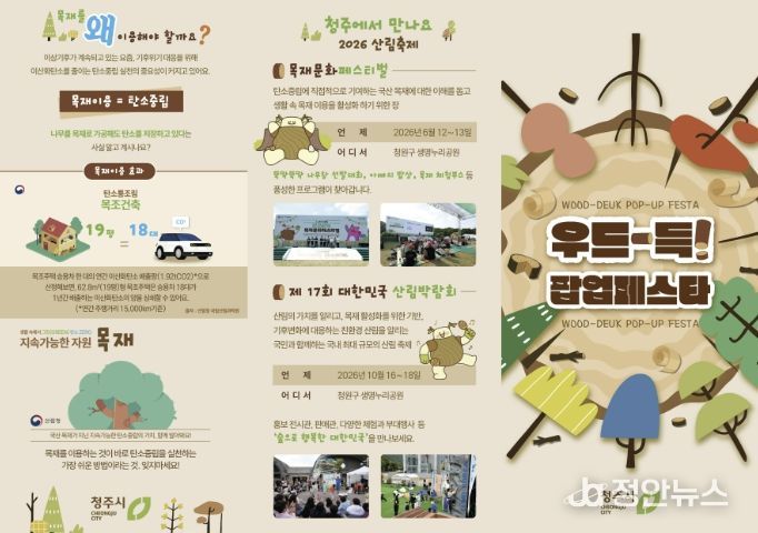 정안뉴스 안정주 기자 | 청주시는 오는 5월 7일부터 10일까지 청원구 생명누리공원에서 목재문화 체험행사 ‘우드-득! 팝업페스타’를 운영한다고 밝혔다.