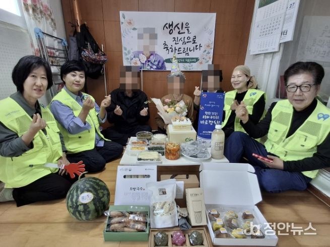 꽃다발과 생신상을 전달하고 따뜻한 담소를 나누며 정서적 지지를 이어갔다. 생신상에는 정미경 단장·여순남 단원이 준비한 미역국·밥·떡·물김치, 이진용 시전4리 이장이 준비한 수박, 김진회 도고면장이 직접 만든 반찬 4종이 올랐다. 아산시사회적기업협의회 참여기업 11개 업체도 케이크·생활용품·식료품 등을 후원하며 온정을 보탰다.