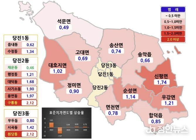 심의 결과 표준지 공시지가 0.72% 소폭 상승함에 따라 올해 당진시 개별공시지가는 전년 대비 0.62% 상승한 것으로 나타났다.