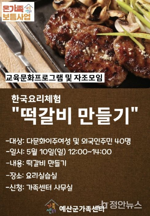 정안뉴스 안정주 기자 | 예산군가족센터는 지역 내 결혼이주여성과 외국인 주민의 한국문화 이해 증진과 안정적인 정착 지원을 위해 오는 5월 10일 한국전통요리 체험 ‘떡갈비 만들기’ 프로그램을 운영한다고 밝혔다.