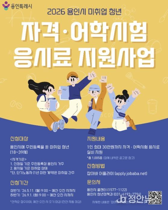 정안뉴스 안정주 기자 | 용인특례시는 취업을 위해 어학과 자격증 시험 등을 준비 중인 청년을 위해 응시료 30만 원을 지원한다고 30일 밝혔다.