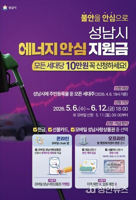정안뉴스 안정주 기자 | 성남시는 중동 사태에 따른 국가 자원안보 위기 경보 발령으로 경제적 부담이 커진 시민들을 지원하기 위해 전국 최초로 ‘성남시 에너지 안심지원금’을 오는 5월 6일부터 신청을 받는다고 밝혔다.