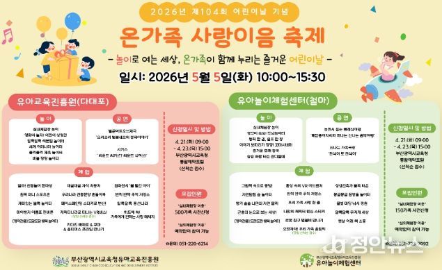 정안뉴스 안정주 기자 | 부산광역시교육청유아교육진흥원은 제104회 어린이날을 맞아 오는 5월 5일 오전 10시부터 유아교육진흥원(다대포)과 유아놀이체험센터(철마)에서 3~5세 유아와 학부모가 참여하는‘온가족 사랑이음 축제’를 개최한다.