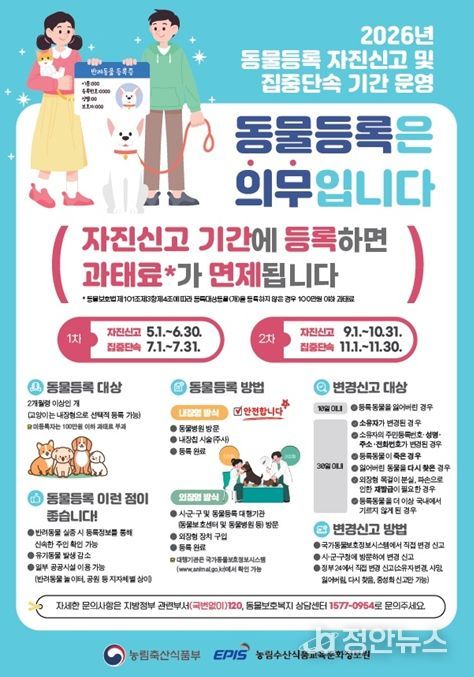 정안뉴스 안정주 기자 | 인천광역시는 반려견 등록 활성화와 등록 정보의 정확성 제고를 위해 2026년 동물등록 자진신고 기간(1차 5~6월, 2차 9~10월)을 운영한다고 밝혔다.