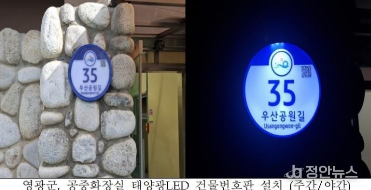 정안뉴스 안정주 기자 | 영광군은 관내 공원, 관광지 등 공중화장실에 범죄 노출 및 위급상황 발생 시 신속한 주소정보를 제공하기 위한 ‘태양광LED 건물번호판’을 설치했다.
