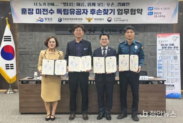 정안뉴스 안정주 기자 | 영광군은 지난 29일 영광군청 2층 소회의실에서 ‘훈장 미전수 독립유공자 후손 찾기’ 사업 추진을 위한 업무 협약을 체결했다.