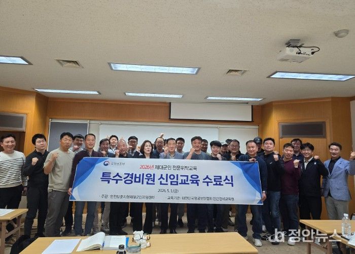 정안뉴스 안정주 기자 | 국가보훈부 인천보훈지청 제대군인지원센터는 4월 30일 16시 경기도 김포시 소재 사)한국항공보안협회 민간경비교육원에서 제대군인 전문위탁교육인“2026년 특수경비원 신임교육과정”수료식을 개최했다고 밝혔다.