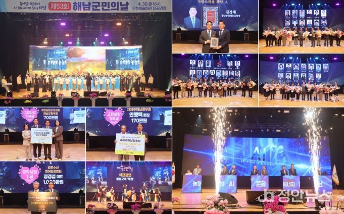 정안뉴스 안정주 기자 | 해남군은 제53회 해남군민의 날 기념행사를 4월 30일 해남문화예술회관 대공연장에서 군민과 관계자 등 1,000여명이 참석한 가운데 성황리에 개최했다.
