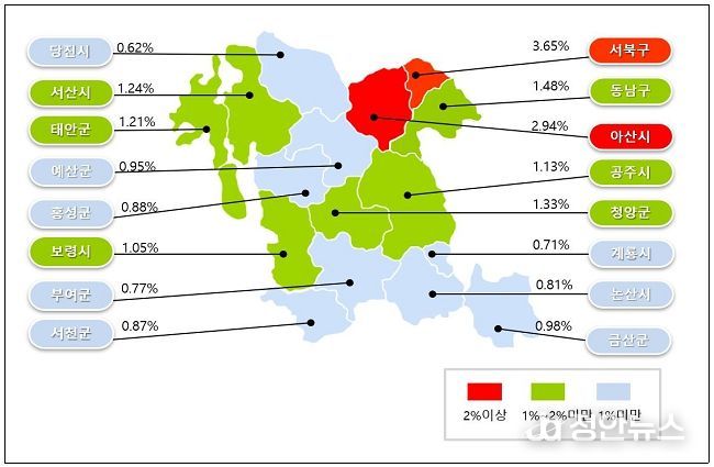 시군별 변동률은 천안시 서북구가 3.65%로 가장 높았고, 아산시가 2.94%로 뒤를 이었으며, 변동률이 가장 낮은 지역은 당진시 0.62%로 나타났다.