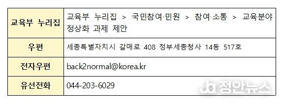 아울러, 교육부는 ‘교육 분야 정상화 과제 제안’ 창구를 지속 운영하여, 정책수요자가 생각하는 불합리한 사례들에 대해 지속적으로 관리하고, 최소 반기별로 정상화 과제를 지속 선정‧관리해 나갈 계획이다.