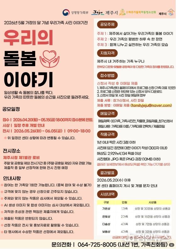 접수 기간은 5월 15일까지이며, 심사를 통해 선정된 11가족에게는 상장과 상품권이 수여된다. 선정작은 5월 26일부터 6월 5일까지 제주시청 제1별관 로비에 전시될 예정이다.