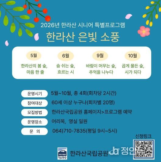 정안뉴스 안정주 기자 | 제주특별자치도 세계유산본부 한라산국립공원관리소는 5월부터 10월까지 총 4회에 걸쳐 어리목, 영실 일대에서 시니어를 위한 특별프로그램‘한라산 은빛 소풍’을 운영한다.