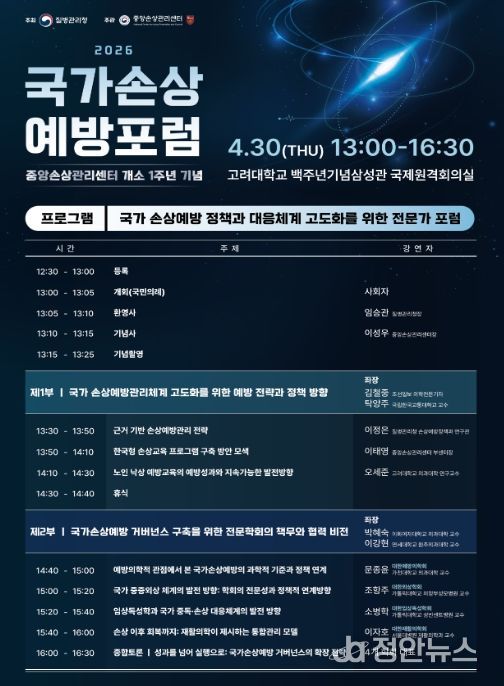 정안뉴스 안정주 기자 | 질병관리청은 중앙손상관리센터 개소 1주년을 맞아 4월 30일 고려대학교 백주년기념삼성관에서 「2026년 국가손상예방포럼」을 개최한다.