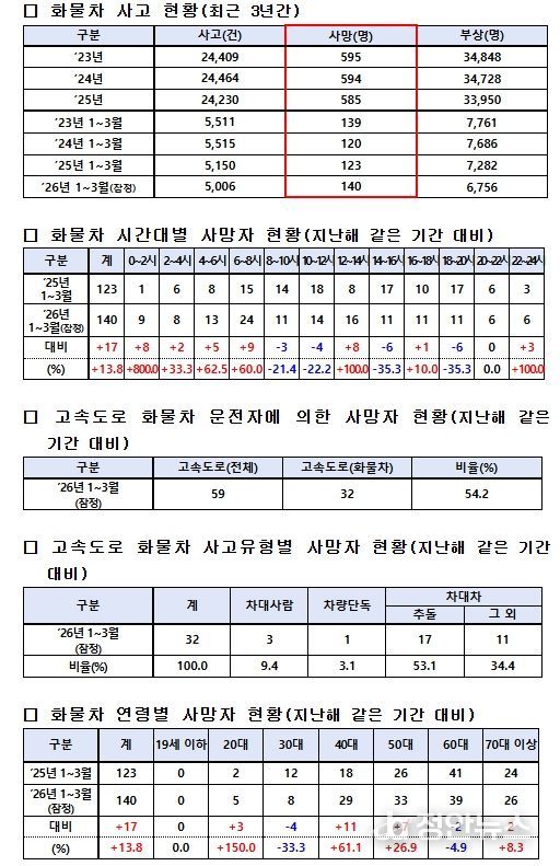 경찰청 교통사고 통계에 따르면 2026년 3월까지 발생한 화물차 사망사고(잠정)는 최근 3년 같은 기간 평균(1~3월) 발생한 사망자인 127.3명보다 9.9% 증가한 수준인 140명이 발생했다.