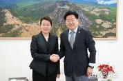 정안뉴스 안정주 기자 | 제주특별자치도와 중국 산둥성이 칭다오 항로를 기반으로 한 통상 협력과 친환경 산업 분야 공동 발전을 위한 협력을 한층 강화한다. 오영훈 제주지사는 30일 오전 도청 집무실에서 대외무역과 통상 업무를 총괄하는 왕레이(王磊) 중국 산둥성 상무청장을 비롯한 방문단 7명과 면담을 갖고 양 지역 간 수출입 확대, 칭다오 항로 물동량 증대, 그린수소 등 친환경 산업 협력 방안을 폭넓게 논의했다. 오 지사는 “산둥성과 제주의 우호 협력 관계가 한층 높아진 가운데 칭다오 항로가 새롭게 연결되면서 교류 협력이 급속도로 발전하고 있다”며 “산둥성 정부의 강력한 의지 덕분으로, 도민들과 함께 더 큰 발전을 기대하고 있다”고 말했다. 오 지사는 제주 삼다수의 중국 수출이 5월부터 본격 개시된다는 점을 언급하며 통관 절차의 신속한 처리를 요청했다. 또한 이날 왕레이 청장 일행의 한라산소주 방문 일정과 관련해 한라산소주가 수도권과 미국 시장에서 높은 신장세를 보이고 있다며 산둥성으로부터의 소주병 원료 수입 검토 상황을 설명하고, 한라산소주와 칭다오맥주의 협업(컬래버레이션) 가능성도 제안했다. &nb