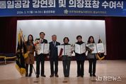 정안뉴스 황도연 기자 | 민주평화통일자문회의 충남지역회의(부의장 정윤)는 2월 9일 오후 2시, 홍성문화원에서 '통일공감 강연회 및 의장표창 수여식'을 개최했다. 의장(대통령)표창은 민주평화통일자문회의 활동에 적극 참여하며 평화통일 공감대 확산과 지역 통일 활동 활성화에 기여한 자문위원과 협의회, 대행기관 공무원에게 수여된다. 이번 수여식에서는 의장이신 대통령을 대신하여 정윤 충남부의장이 자문위원 23명과 공무원 2명, 2개 지역협의회를 수여했으며, 참석한 자문위원과 지역주민들을 위해 평화통일의 필요성에 대한 이해를 높이기 위한 ‘통일공감 강연회’도 진행했다. 정윤 부의장은 “오늘 표창을 받으신 자문위원 여러분과 공무원, 행정실장께서는 민주평통의 가치와 사명을 현장에서 묵묵히 실천해 오신 분들이다.”며 “이분들의 헌신과 노력이 있었기에 지역사회 속에서 통일공감대가 확산되고 민주평통의 역할 또한 더욱 굳건해질 수 있었다.”라고 말했다. 민주평통 충남지역회의는 앞으로도 평화공존, 공동성장의 한반도 구현을 위한 다양한 프로그램을 통해 국민과 함께하는 평화통일 공감대 확산에 적극 나설 계획이다.