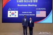 정안뉴스 황도연 기자 | 아산시는 24일 글로벌 첨단 유리소재 선도기업인 코닝정밀소재㈜를 방문해 임직원들과 간담회를 갖고 지역경제 활성화와 상생협력 방안을 논의했다고 밝혔다. 이번 방문은 코닝정밀소재의 생산 현장을 직접 둘러보고, 최근 디스플레이 산업의 기술 변화와 기업 애로사항을 청취하며 지역 산업 생태계와 연계한 협력 방안 및 지역경제 회복 방향을 모색하기 위해 마련됐다. 간담회에는 오세현 시장을 비롯해 이재성 기획경제국장 등 시 관계자와 반 홀(Vaughn M. Hall Jr.) 코닝정밀소재 대표이사와 임원진 등 20여 명이 참석했다. 양측은 △코닝의 첨단 건축용 유리제품 공공건축물 적용 △아산시 관내 기업 이용 및 청년 현장견학 프로그램 운영 △아산페이 더블혜택 이벤트 홍보 △지역 농산물 이용 등 다양한 상생 협력 과제에 대해 의견을 교환했다. 이 자리에서 오 시장은 “디스플레이 산업은 초고해상도, 대형화, 폴더블 등 기술 패러다임이 빠르게 전환되고 있으며, 그 중심에 코닝의 초박막‧고기능성 유리 기술이 있다”고 평가했다. 특히 “코닝정밀소재는 아산의 미래산업을 함께 설계하는 든