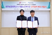 대불노인복지관(관장 변지호)은 3월 11일(수) 복지관 3층 주민 커뮤니티센터에서 대구보건대학교와 산학협력 협약(MOU)을 체결했다. 이번 협약은 지역사회와 대학이 협력하여 어르신들의 건강 증진과 지역복지 발전을 도모하고, 양 기관의 인적·물적 자원을 연계한 다양한 협력 프로그램을 추진하기 위해 마련됐다. 이날 협약식에는 대불노인복지관 변지호 관장과 대구보건대학교 김지인 대외부총장을 비롯한 양 기관 관계자들이 참석한 가운데 협약서 서명과 기념촬영 등이 진행됐다. 이번 협약을 통해 양 기관은 ▲산학협력 및 지역사회 협력 프로그램 추진 ▲대학·주민 커뮤니티센터 활용 프로그램 운영 ▲힘찬건강대학 보건의료 교육 지원 ▲인적 교류 및 공유자원 협력 ▲지역사회 동반성장 네트워크 구축 등 다양한 분야에서 상호 협력을 이어갈 예정이다. 대구보건대학교 김지인 대외부총장은 “이번 협약을 통해 대학의 보건의료 전문성을 지역사회와 공유하고, 어르신들의 건강 증진과 삶의 질 향상에 실질적인 도움이 되기를 바란다“며 ”지역사회와 연계한 다양한 교육과 협력 활동을 통해 건강한 지역사회 조성에 힘쓰겠다“고 말했다. 이어 대불노인복지관 변지호 관장은 “이번 협약을 통해 지역사회와 대학이