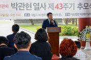 정안뉴스 안정주 기자 | 이정선 광주시교육감이 12일 국립5·18민주묘지 ‘역사의 문’ 앞에서 열린 ‘민주화의 새벽기관차 박관현 열사 제43주기 추모식’에 참석했다. 이날 추모식에는 이정선 교육감을 비롯해, 강기정 광주광역시장, 윤목현 5·18기념재단 이사장, 이개호 영광군 국회의원, 유족 및 시민사회단체 관계자 등이 참여해 열사의 숭고한 뜻을 기렸다. 이정선 교육감은 “박관현 열사의 숭고한 정신을 잊지 않고 기억하는 길은 5·18 정신을 미래 세대에 계승하고 발전시키는 교육이다”며, “오월 정신을 전국으로, 세계로 알리고 확산하여 민주주의와 인권, 평화의 가치를 교육 현장에서 실천해 나가겠다”고 밝혔다.