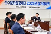 정안뉴스 김재홍 기자 | (재)진주문화관광재단은 지난 19일 진주시청 5층 상황실에서 조규일 이사장을 비롯한 임원들이 참석한 가운데 ‘2025년 정기이사회’를 개최했다. 이번 이사회에서는 ▲2025년 주요업무 추진실적 ▲2026년 사업계획 보고 ▲2026년 재단 예산편성안 ▲기금운용 계획안 등이 의결됐으며, 진주시의 문화예술과 관광산업, 그리고 재단 발전을 위한 다양한 의견들이 논의됐다. 2026년 진주문화관광재단의 예산은 150억 원 규모이며, 기금 지원사업을 비롯한 고유목적사업 20개와 2026 국가유산미디어아트를 비롯한 7개의 위탁사업을 추진할 계획이다. 특히 내년에는 ‘빛 담은 문화도시 진주’ 2년 차를 맞아 실크와 유등, 캐릭터 등 대표 콘텐츠의 활성화와 문화상품의 홍보마케팅 지원 등 문화콘텐츠 고도화 사업을 추진하고, 관광객 유치를 위한 상품개발과 홍보마케팅을 강화해 나갈 예정이다. 조규일 이사장은 “진주문화관광재단은 21년 설립 이후 4년 동안 진주를 문화예술로 행복하고, 관광으로 빛나는 부강한 도시로 만들기 위해 노력해 많은 성과를 이뤄냈다”며, “2026년에도 시민을 위한 문화관광 전문기관으로서